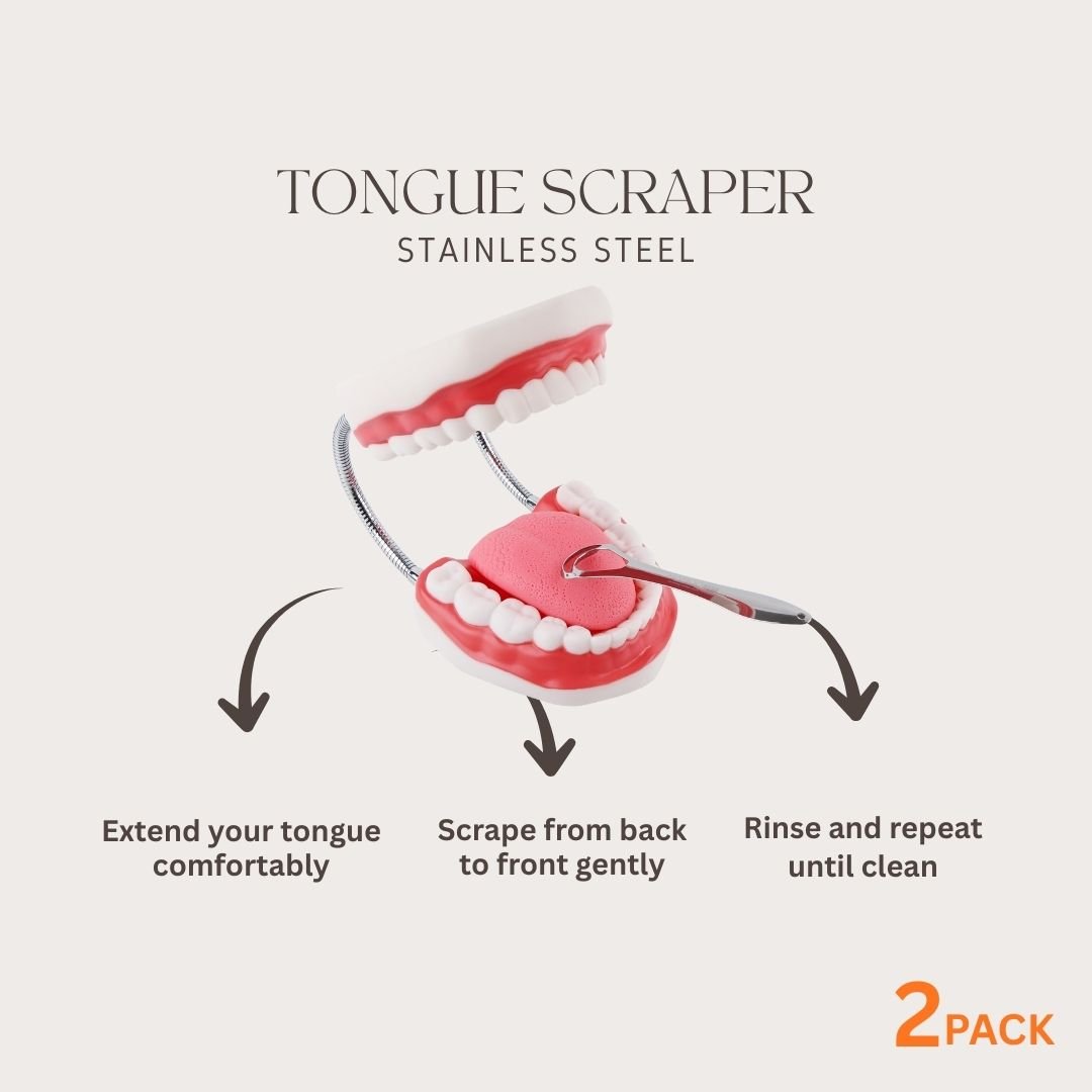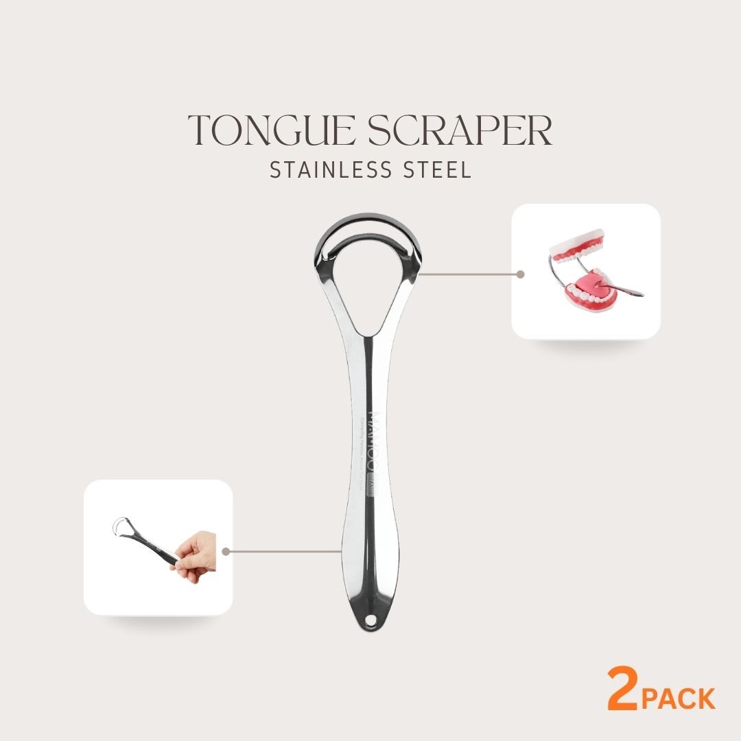 2 × Stainless Steel Single-Handle Tongue Scrapers, 2 × Travel Cases. No batteries or electricity required. Eco-friendly alternative to disposable plastic tongue scrapers.