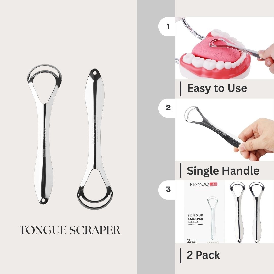 The Mamoojan Tongue Scraper is a premium stainless steel oral hygiene tool designed to gently and effectively remove bacteria, debris, and buildup from the surface of your tongue. Each pack includes two single-handle scrapers with travel cases, making it easy to maintain fresh breath at home and on the go. The ergonomic single-handle design provides a comfortable grip and full tongue coverage in one smooth motion. Made from durable, medical-grade stainless steel that will not rust, bend, or harbor bacteria — unlike plastic alternatives. Easy to clean with warm water and soap, or soak briefly in mouthwash for a deeper clean. An eco-friendly choice that helps eliminate disposable plastic scrapers from landfills.